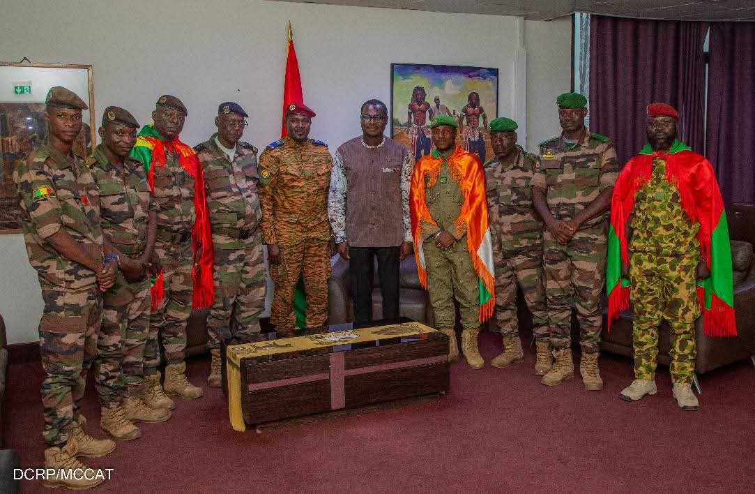 En cours de réalisation de leur clip au Burkina Faso, des artistes de l’Alliance des pays du Sahel réunis sous le concept « AES Engagé », ont été reçus en audience par le ministre de la Communication, de la Culture, des Arts et du Tourisme, Pingwendé Gilbert Ouedraogo, le 7 juillet 2025, à Ouagadougou. Conduite par l’adjudant Zinsonni Kaled alias Kezi, artiste chanteur burkinabè, cette délégation a été composée du capitaine Luc Traoré du Mali et le sergent Mahamane Sani Maigochi du Niger.