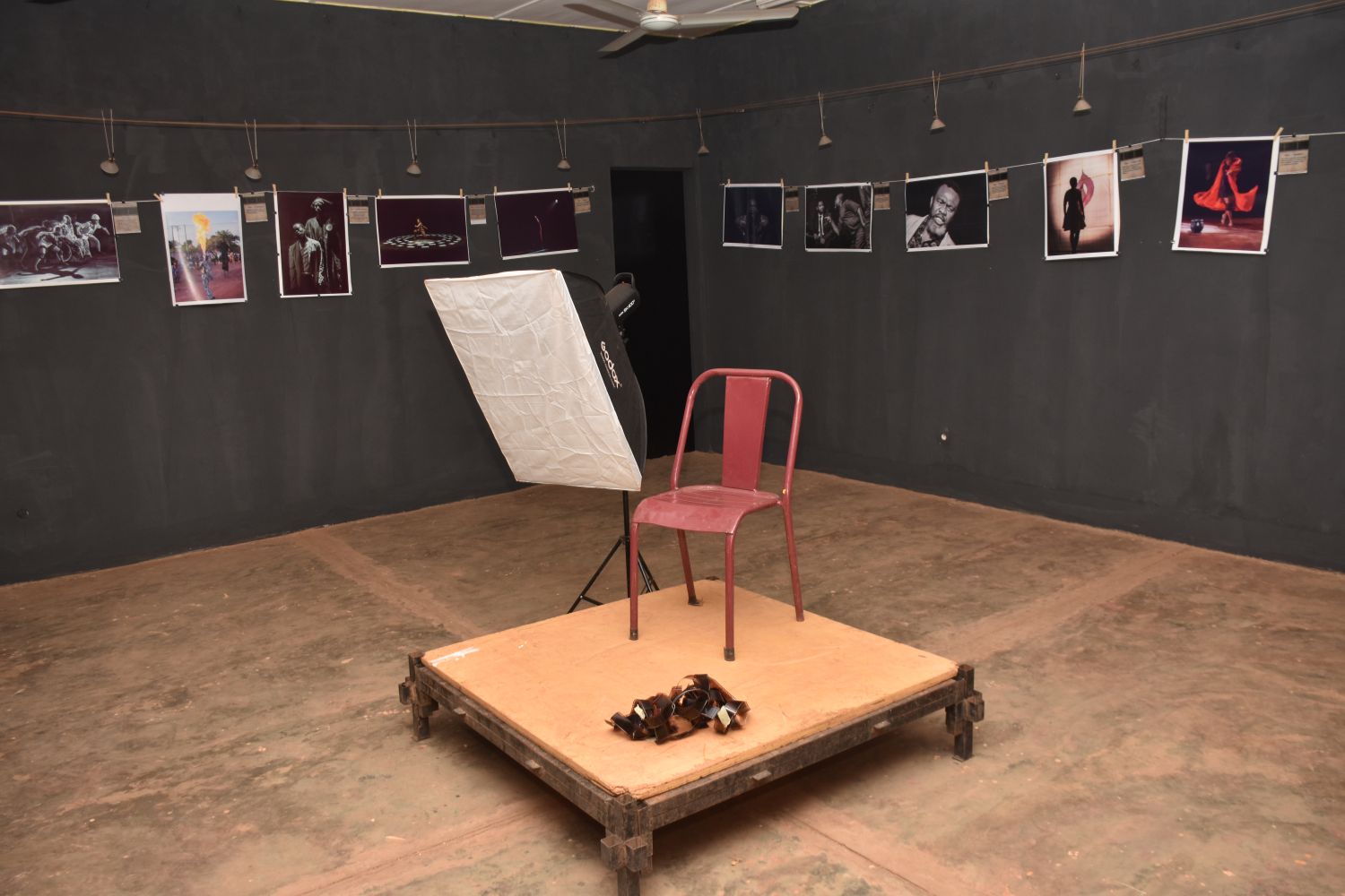 A entendre, Alexandre Meda, co-commissaire avec Claude Guigané de l’exposition, le dispositif de l’exposition est un clin d’œil fait à l’endroit de celui des arts de la scène et un rappel sur les origines de la photographie. Ainsi, « l’agencement de faisceaux de lumière projeté sur chacune des photographies non encadrées accrochées par des pinces sur des parois noir, renvoie à cette liberté d’expression artistique, à une certaine scénographie et bien entendu à l’étanchéité de l’outil de travail qui est l’appareil photo », a expliqué Alexandre Meda. Enfin, selon ce dernier, les présences du dispositif de travail du photographe et des bandes de négatifs sur l’aire de l’exposition dans un premier temps, rendent un hommage aux débuts de la photographie. Et dans un second temps évoque le souhait de rompre avec la rythmique ordinaire des expositions.