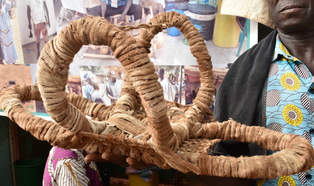 Aussi, dans leur stand logé dans le village des communautés, de nombreux objets traditionnels, culturels et d’arts à valeurs de pièces de musée y sont exposés. Avec fierté, monsieur Kam nous parle du « Taon », un outil conçu à base de liane et de cordons à peau de gros ruminant. Jouant un double rôle social dans la communauté Djan, il affiche l’image d’une figure géométrique, un carré rallongé de demi-cercles sur ses 4 côtés dont opposés en position convers.