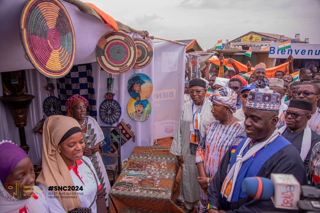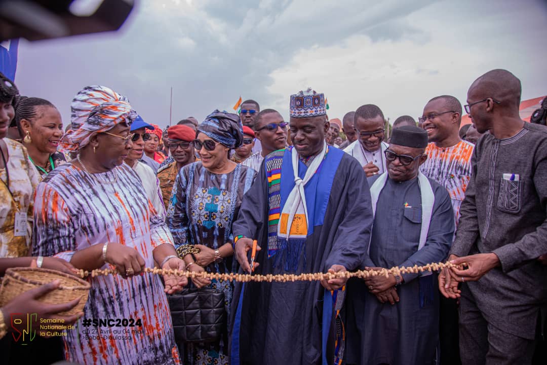 45 communautés vivant au Burkina Faso dont 31 burkinabè et 14 étrangères exposent leur savoir-faire culturel et artistique à l’occasion de cette 21ième édition de la Semaine nationale de la culture (SNC) au sein du village des communautés. Madame la ministre déléguée en charge de la coopération régionale, Stella Eldine Kaboré, accompagnée du ministre d’Etat, ministre en charge de la culture, Rimtalba Jean Emmanuel Ouedraogo et de ses homologues Abdourahamane Amadou et Andogoly Guindo respectivement du Niger et du Mali, ont procédé à l’ouverture officielle du village des communautés le dimanche 28 avril 2024. Et la coupure d’un fil d’arachides a été l’acte symbolique de cette ouverture officielle.